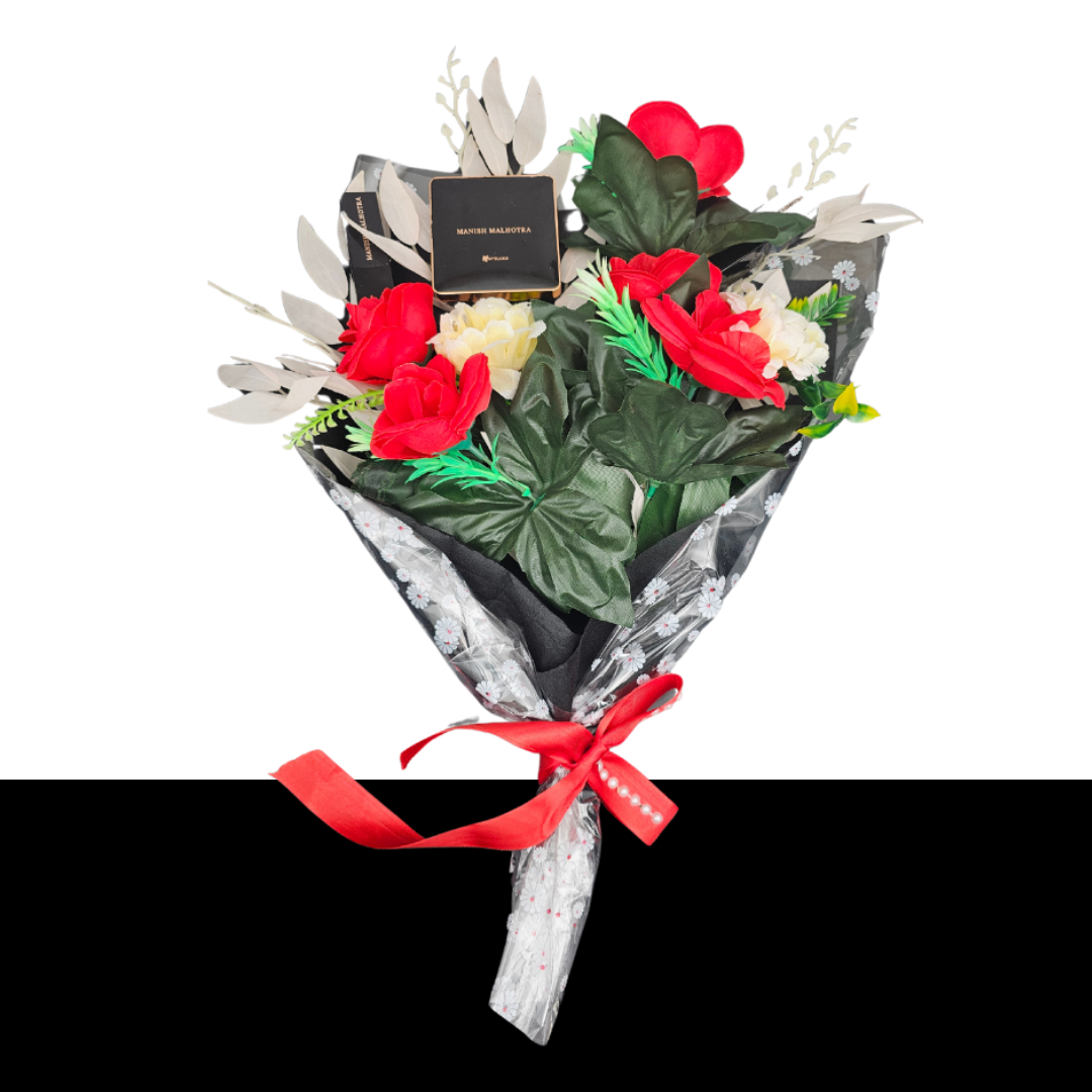 Indulge in luxury with the Artificial Flower Bouquet - Exclusive Manish Malhotra Eyeshadow & Lipstick. This exquisite bouquet features breathtaking, life-like artificial flowers that maintain their charm forever. Paired with an exclusive Manish Malhotra eyeshadow and lipstick set, it's the epitome of elegance and beauty. Surprise your loved one with a gift that transcends the ordinary. The captivating flowers will leave a lasting impression, while the Manish Malhotra makeup allows them to recreate stunning looks. It's a flawless combination of timeless beauty and modern indulgence.