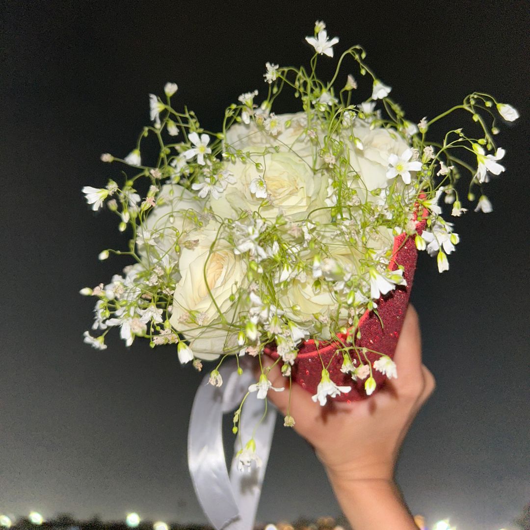 Embrace the festive spirit and order your Artificial White Flowers Wrapped in Red Glitter Sheet today!