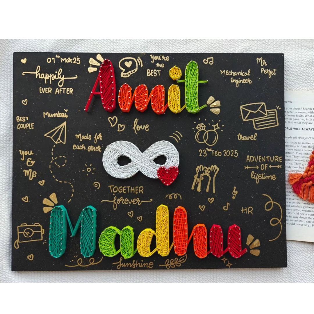 Celebrate love and togetherness with our Couple Name String Art Board, a beautiful handmade piece designed to showcase two names in vibrant string art. This frame is slightly larger than our single-name boards, as it features both names along with a heart or infinity design in between, making it a perfect keepsake for couples.