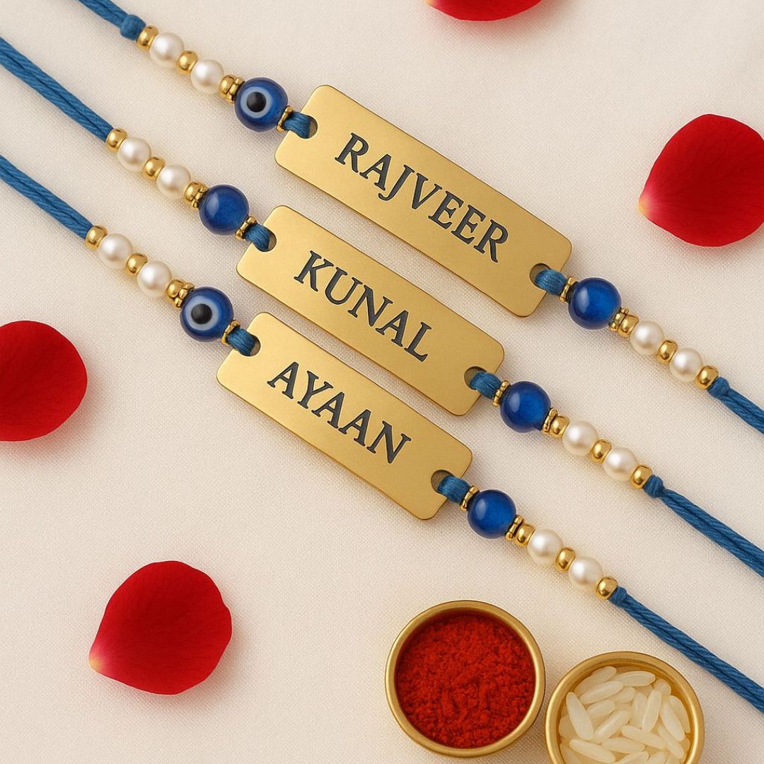Celebrate the bond of love and protection this Raksha Bandhan with our Customized Evil Eye Rakhi, a perfect blend of tradition and personal touch. Handcrafted with care, each rakhi features a stunning gold-toned nameplate personalized with your loved one's name, paired with an elegant evil eye charm to ward off negativity and bring positivity.