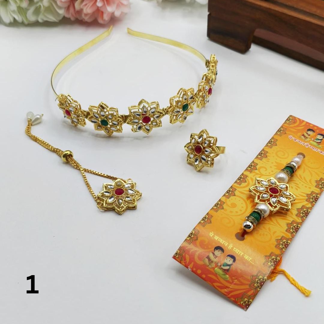 Combo Includes: Hairband, Ring, Bracelet Rakhi, Rakhi