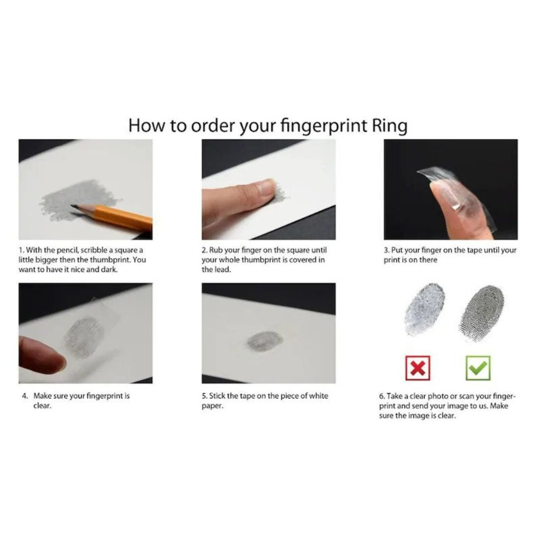 Wear your heart on your finger with a custom fingerprint ring with inside and outside text. This stunning ring is the perfect way to celebrate your love, friendship, or family bond. Your unique fingerprint will be engraved on the outside of the ring, and your custom text will be engraved on the inside as well as outside of the ring. Your order will only include the single ring that you have requested.
