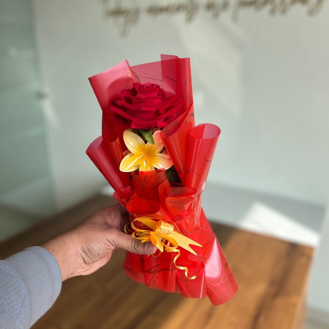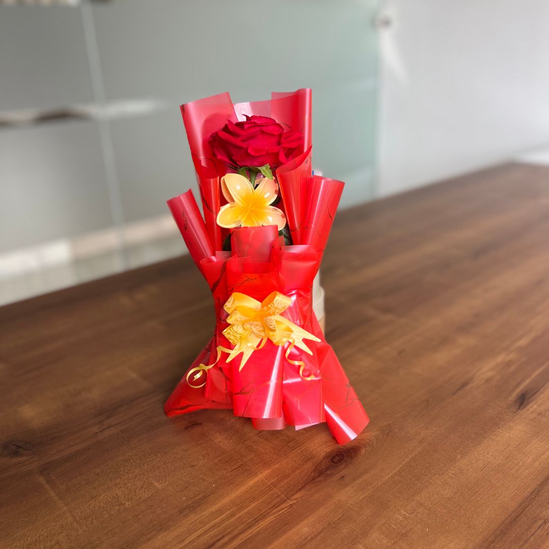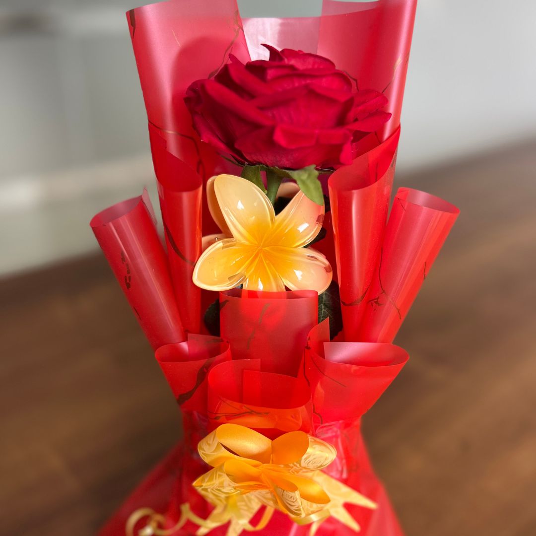 A bouquet that’s both charming and practical! Our Hair Claw Clip Clature Flower Bouquet is an innovative gift featuring a delightful arrangement of vibrant artificial flowers complemented by a stylish and functional hair claw clip. Wrapped in eye-catching red and yellow decorative paper, this bouquet is perfect for someone who appreciates beauty with utility.