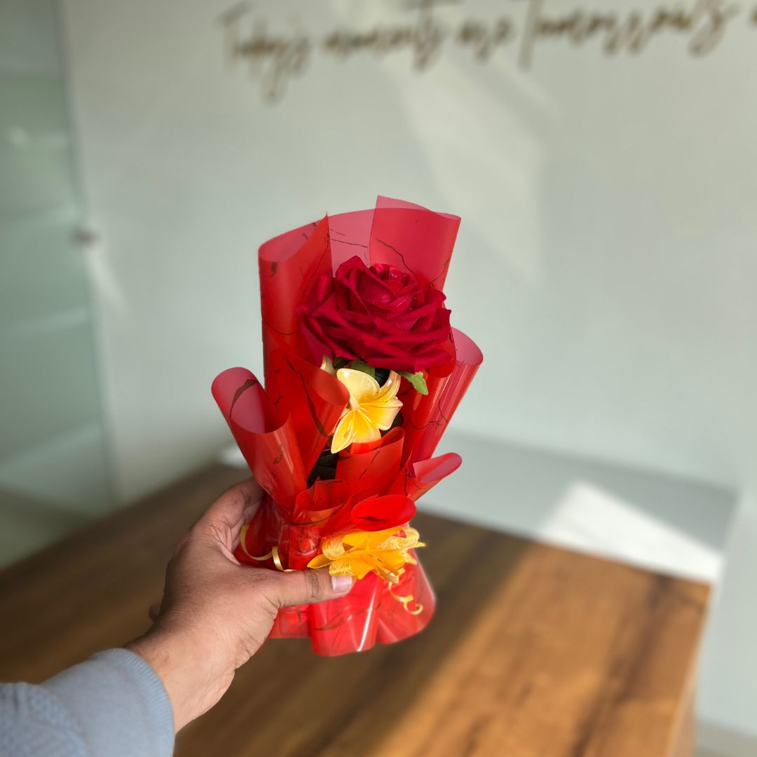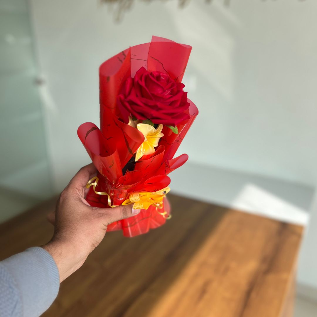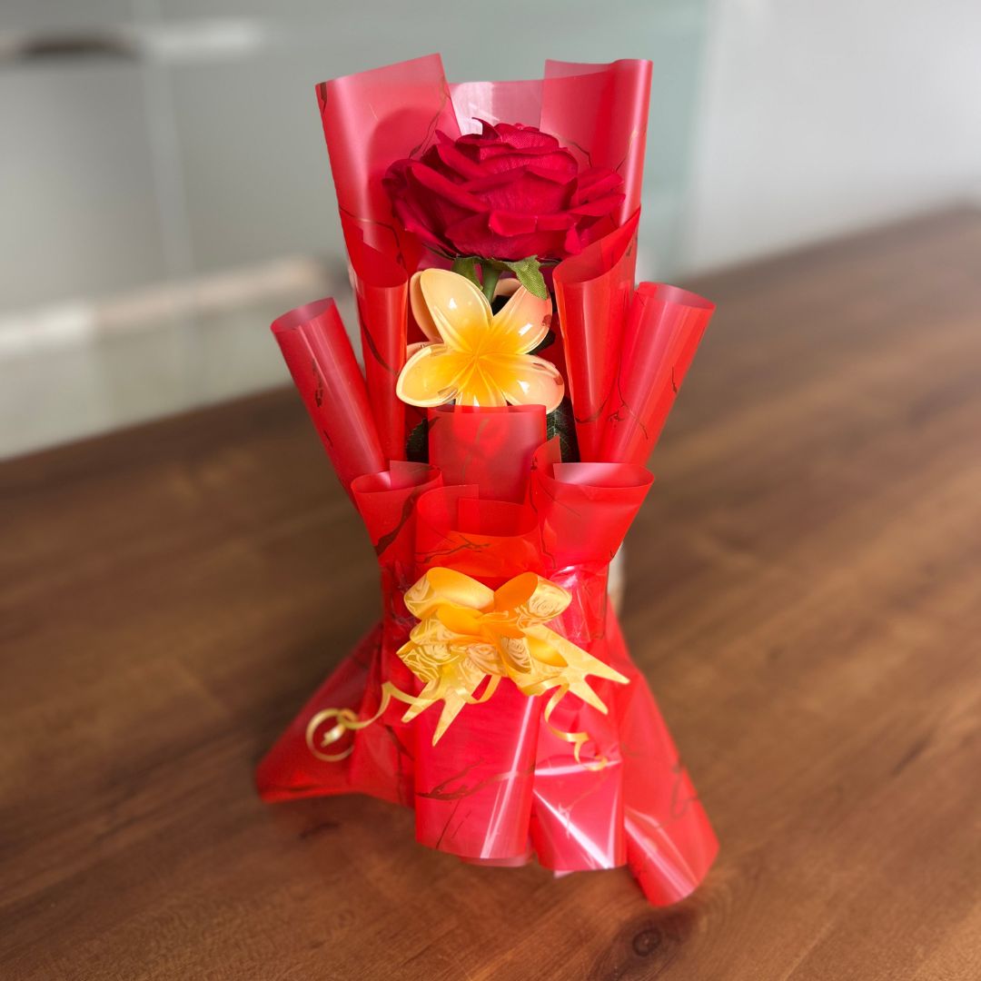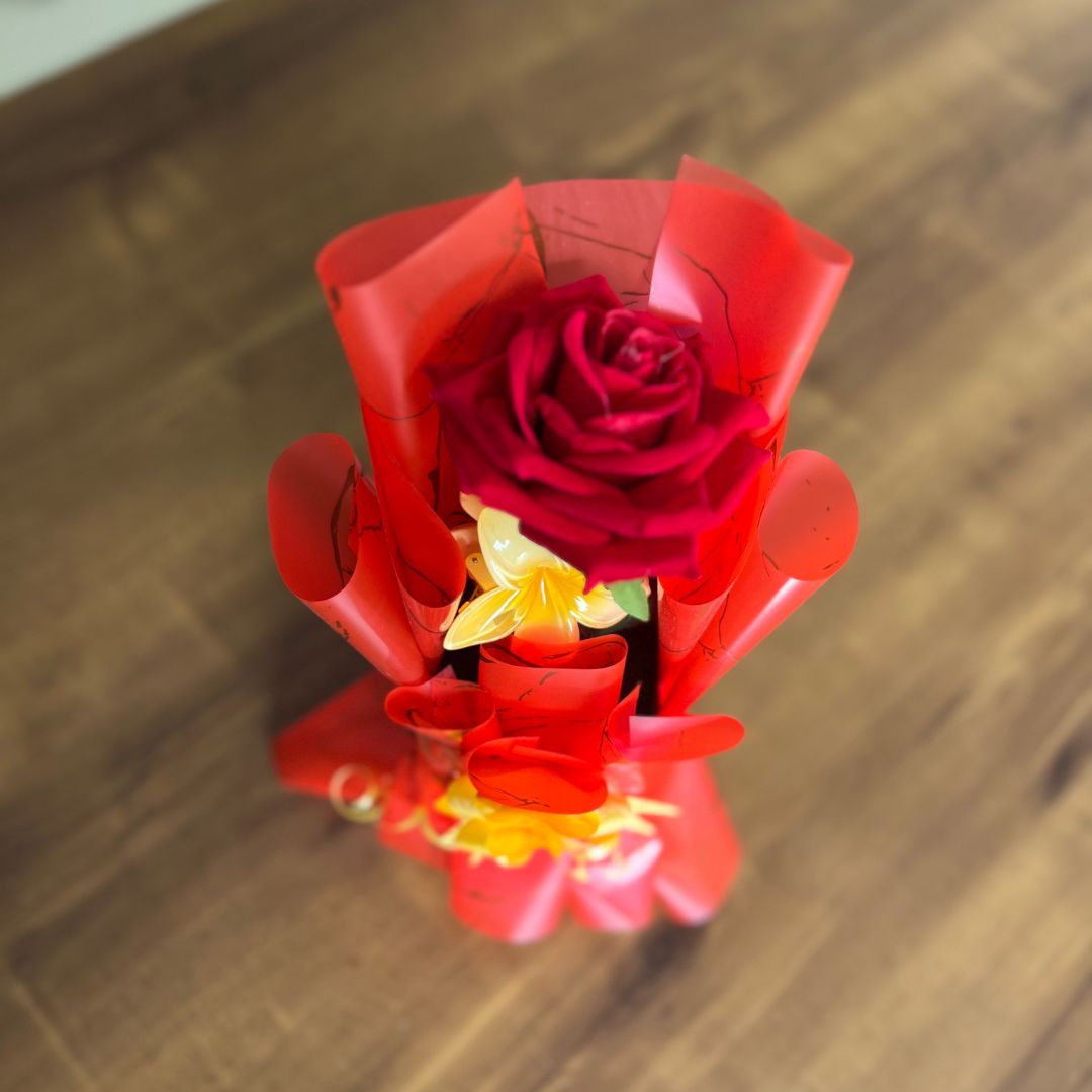 A bouquet that’s both charming and practical! Our Hair Claw Clip Clature Flower Bouquet is an innovative gift featuring a delightful arrangement of vibrant artificial flowers complemented by a stylish and functional hair claw clip. Wrapped in eye-catching red and yellow decorative paper, this bouquet is perfect for someone who appreciates beauty with utility.