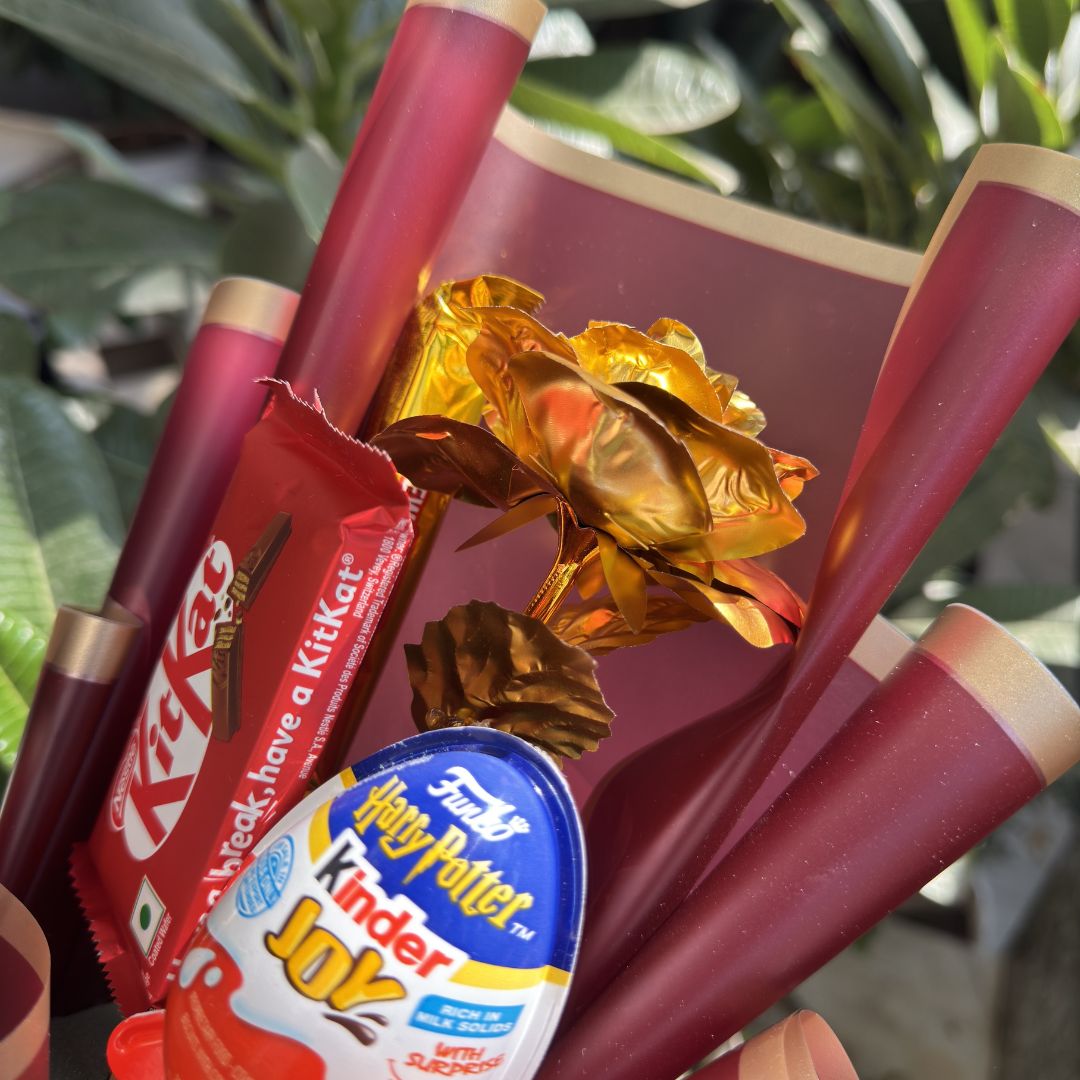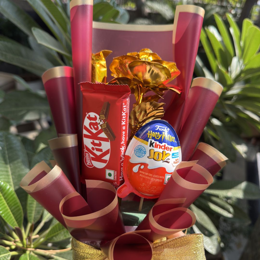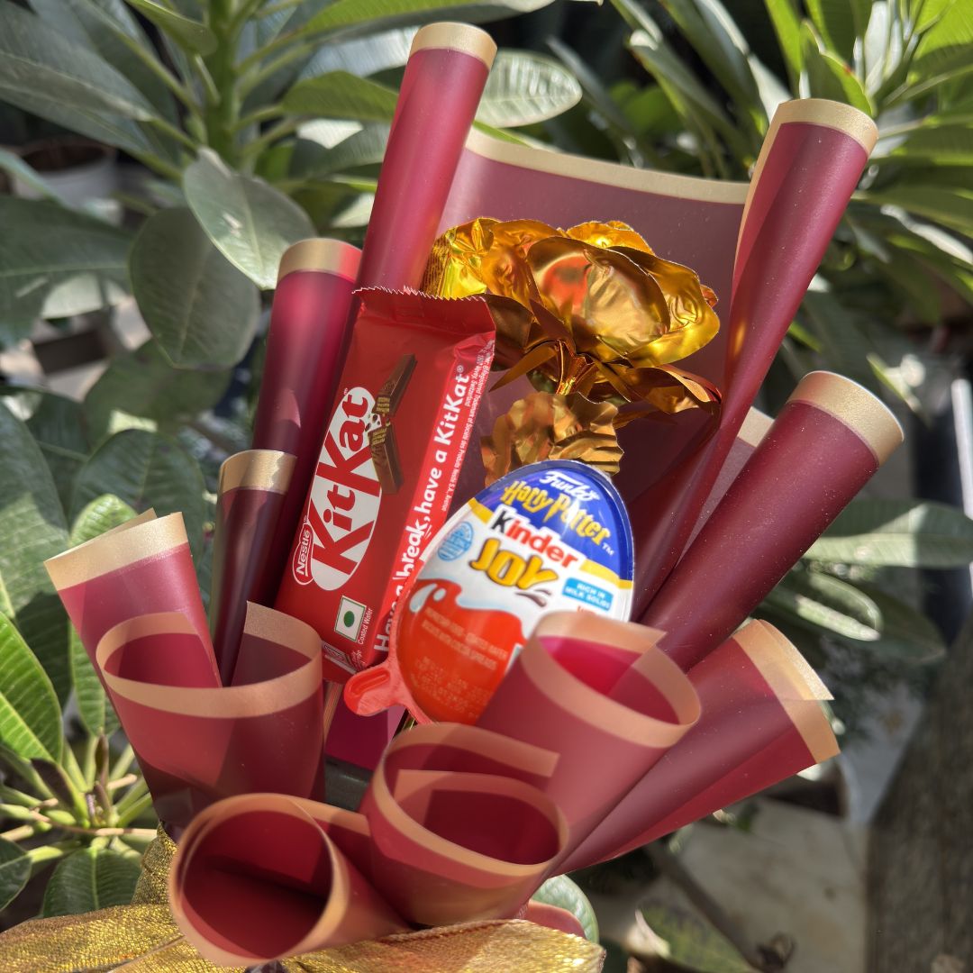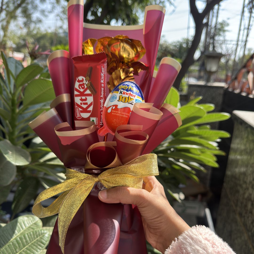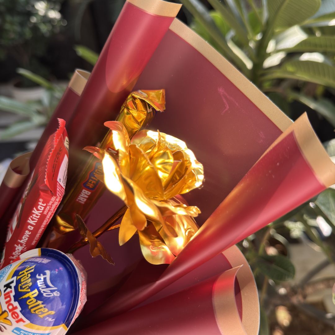Surprise your loved ones with a magical chocolate bouquet that blends luxury with sweetness! Designed with an elegant maroon and gold theme, this handcrafted bouquet is a perfect gift for any occasion.