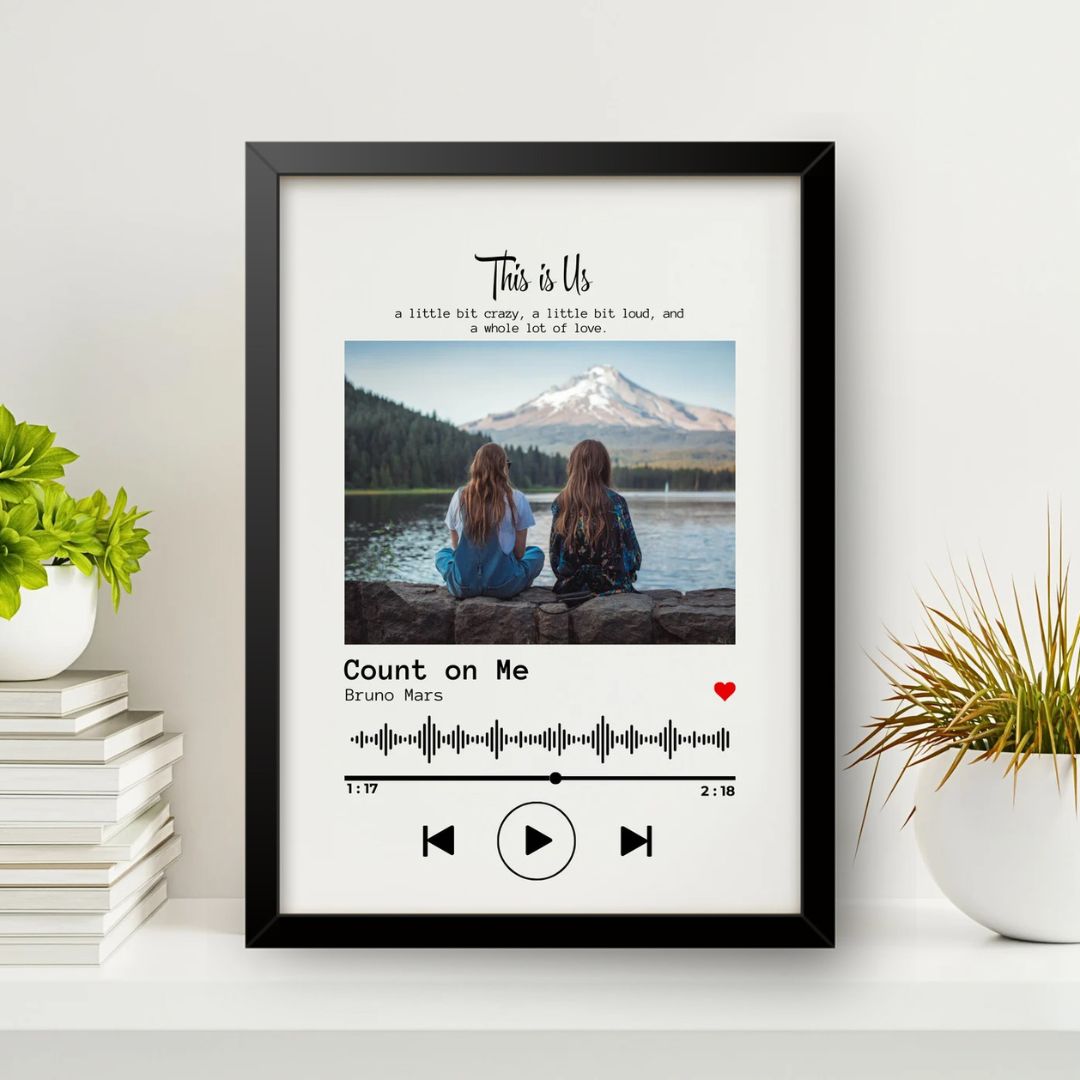 It's simple! Just choose your favorite photo and either paste the link or type the name of your special song on https://open.spotify.com/. We'll create a stunning frame featuring your photo, the song title, and artist. Plus, we'll include a scannable Spotify code so you can instantly play the song whenever you want.