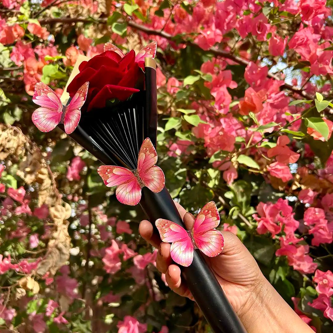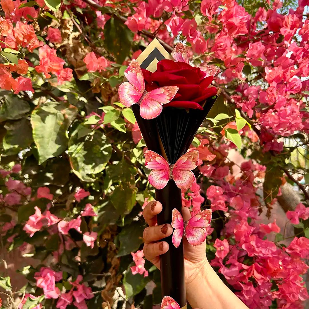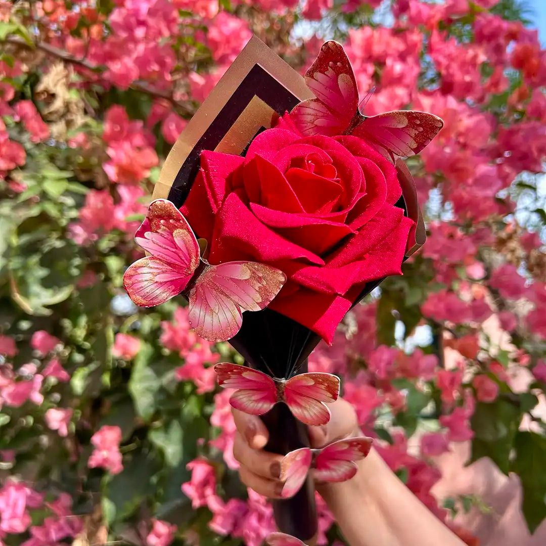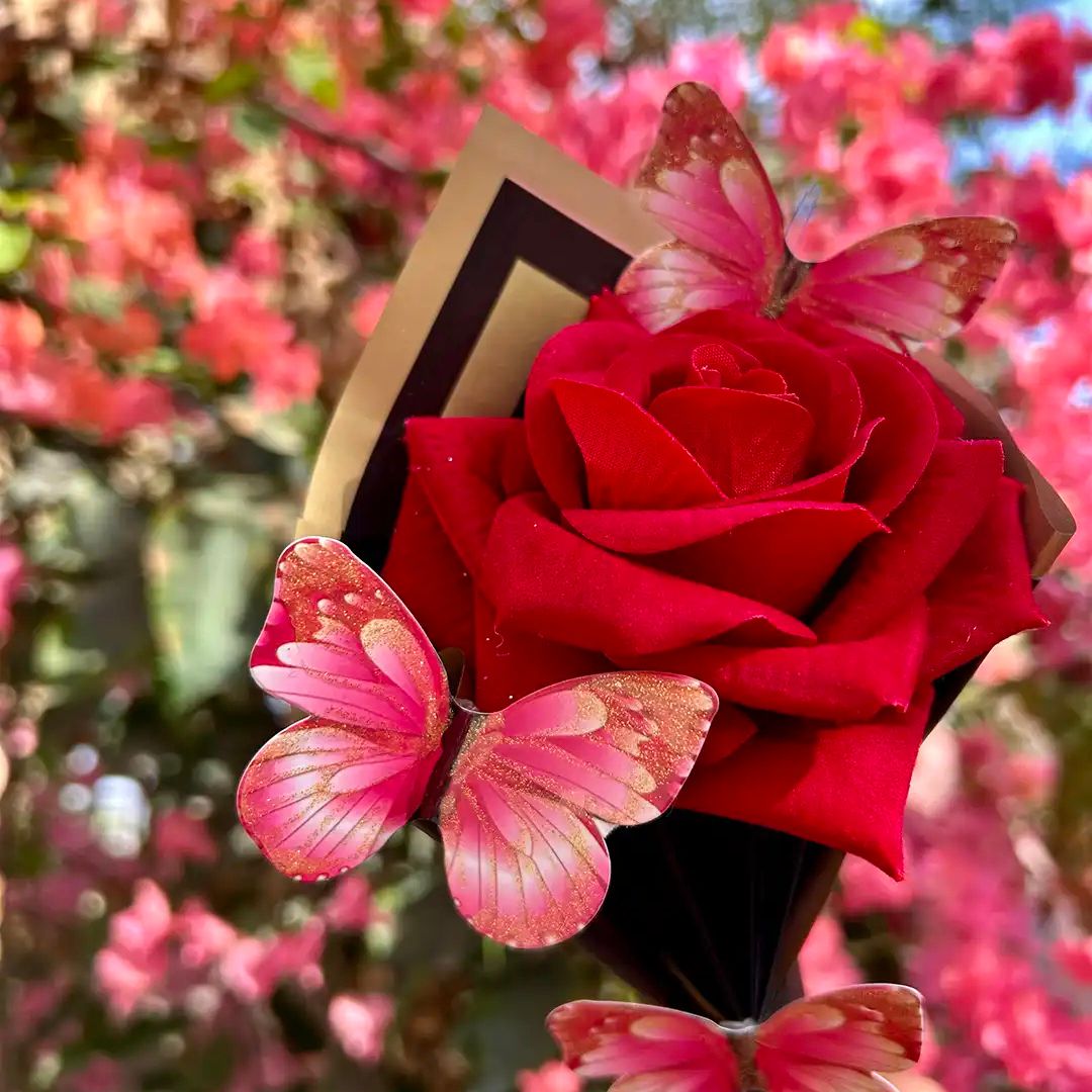Experience the timeless elegance of our Velvet Rose Bouquet—a stunning, single rose crafted from luxurious velvet fabric. This exquisite flower, with its rich, soft texture and deep, captivating color, is complemented by delicate butterflies gently perched on its petals, creating a perfect harmony of beauty and grace. The butterflies add a touch of whimsy and charm, making this bouquet a unique and enchanting gift. Whether for a romantic gesture or a special occasion, this velvet rose brings a lasting impression of love, elegance, and nature's delicate beauty.
